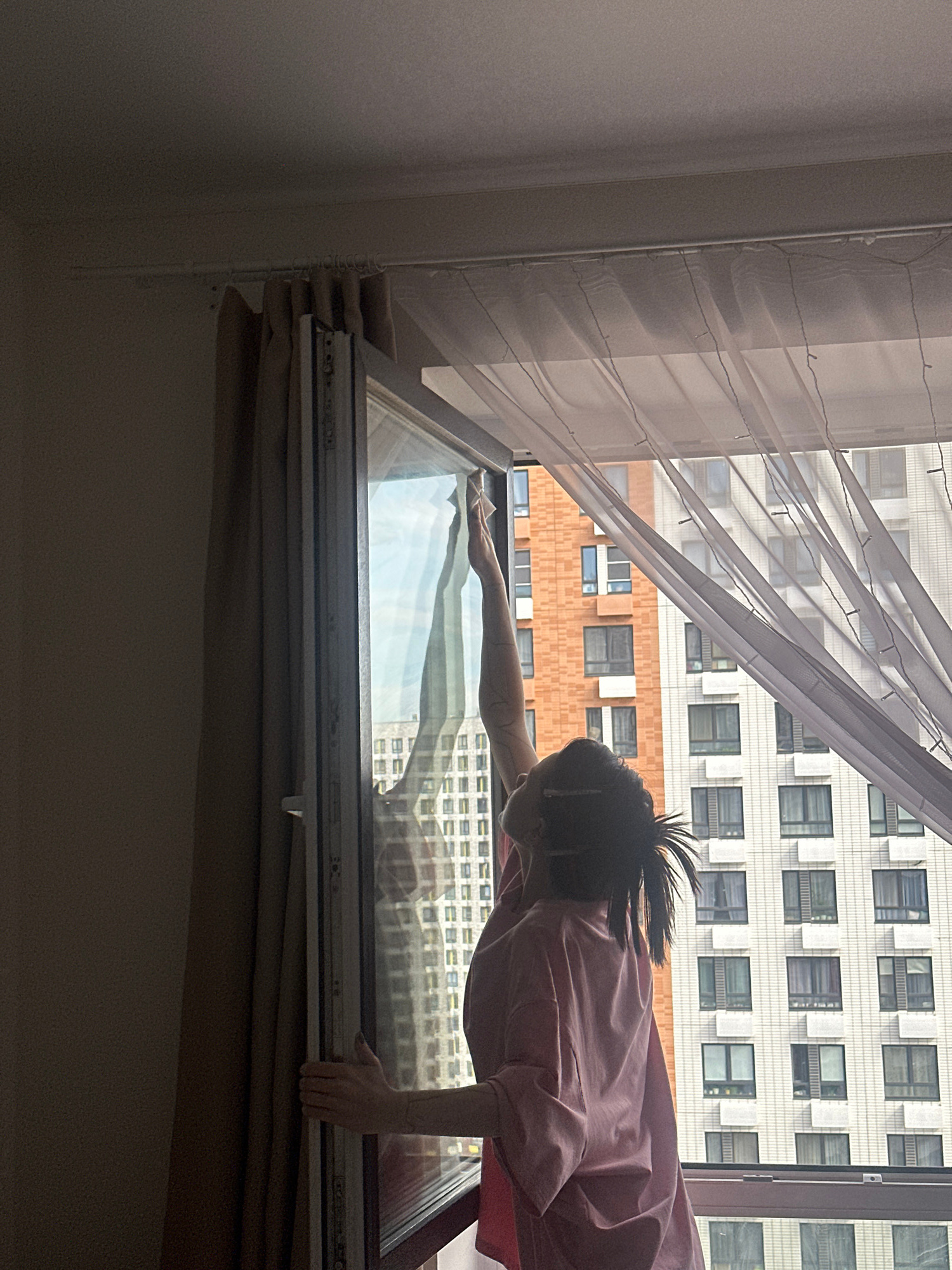 A woman wearing a pink shirt is cleaning a window from inside a room. Outside the window, a view of buildings reflects in the glass. The window is framed by white curtains. The location is possibly in…read more