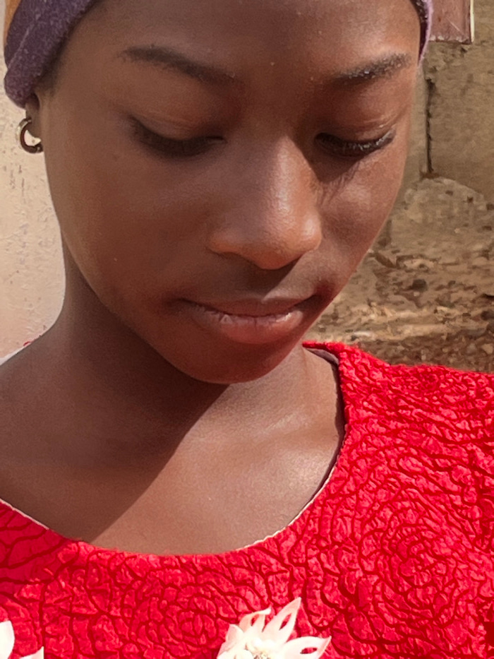 A close-up portrait of an individual, likely female, with dark skin, is depicted outdoors in Jos, Nigeria. The subject's head is angled downwards, with eyes closed or directed towards the ground, and…read more