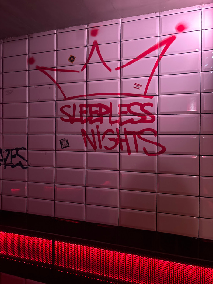 A white tiled wall in the Madrid Metro system, Madrid, Spain, is illuminated primarily by pink and red lighting. The wall consists of numerous rectangular, beveled white ceramic tiles arranged in hori…read more