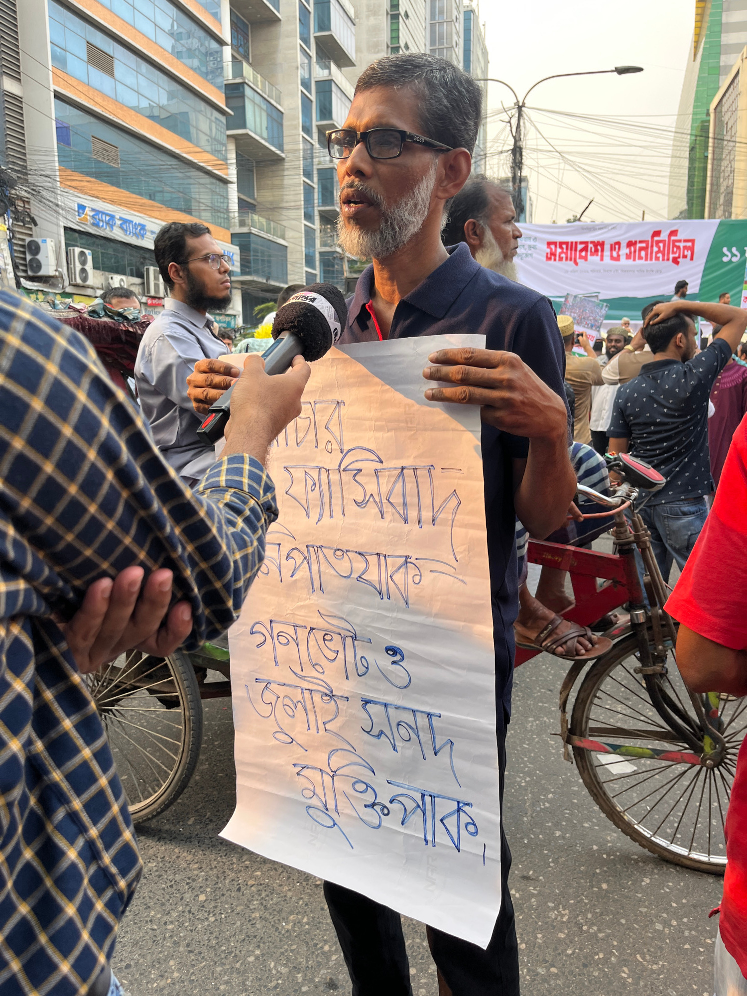 The image shows a street scene in Dhaka, Bangladesh. A man with glasses and a gray beard is holding a sign with writing in Bengali script. He is being interviewed by someone holding a microphone. The…read more