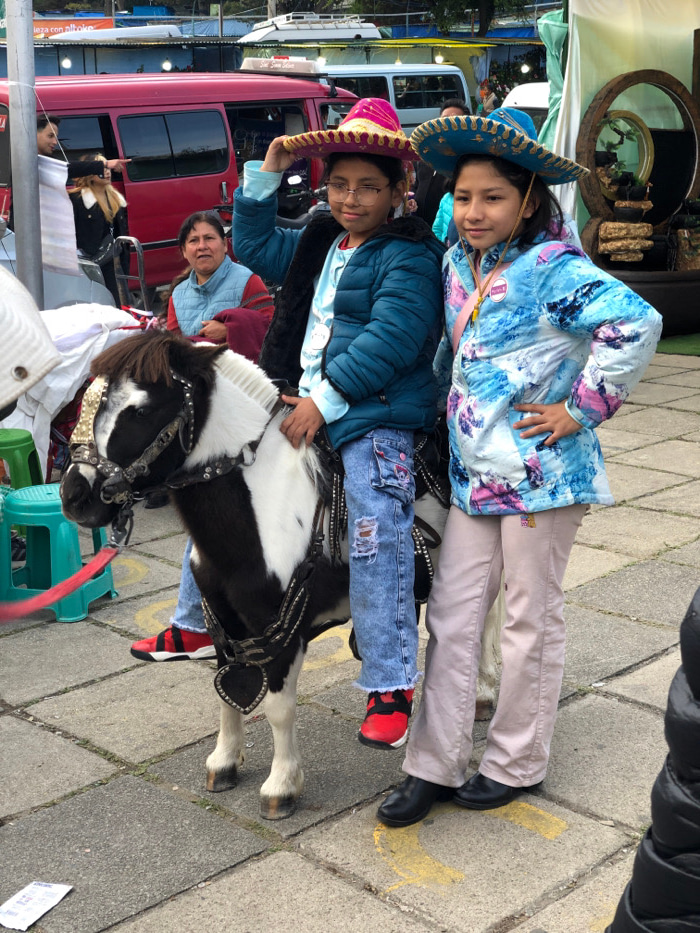 Two young girls in sombreros are on a black-and-white pony. One wears a blue jacket and ripped jeans with red-and-black sneakers, while the other sports a blue, tie-dye style coat and tan pants with b…read more