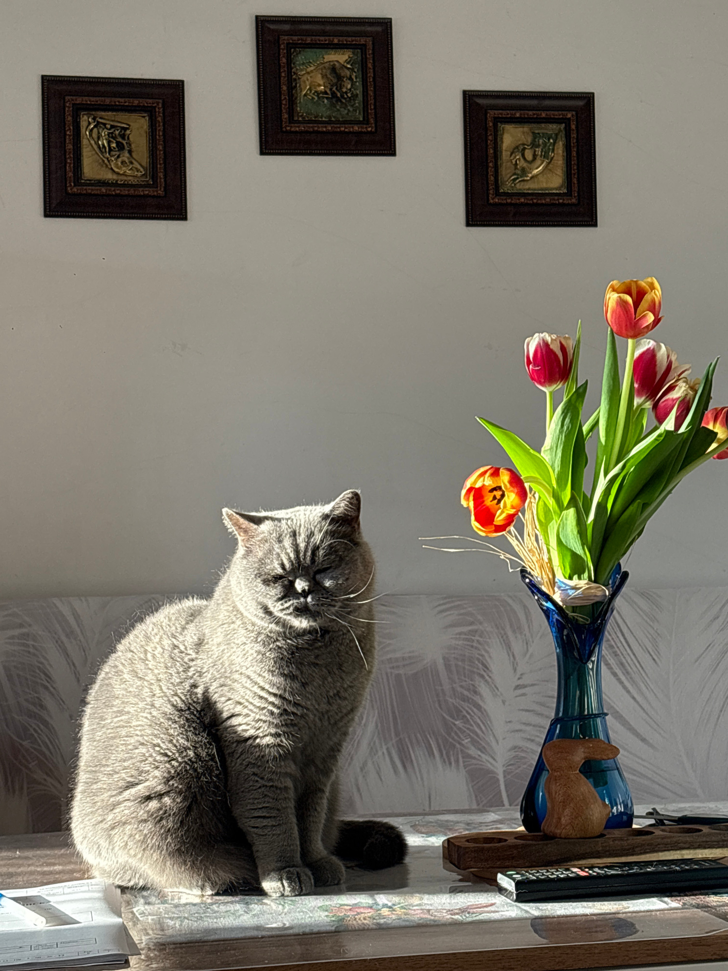 A gray cat is sitting on a wooden shelf in front of a wall with three framed pictures and a vase of tulips. The vase is blue and has a wooden rabbit figurine attached to it. The location is likely in…read more