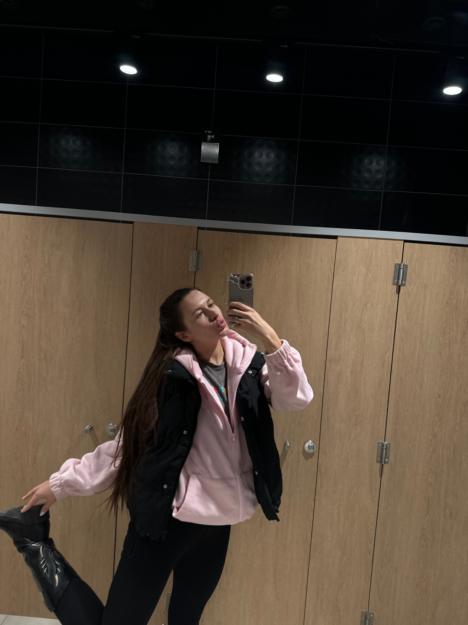 A woman is taking a selfie in what appears to be a locker room. She is wearing black pants, a pink jacket over a black jacket and black boots. She is holding a phone in her hand. The room has wooden l…read more