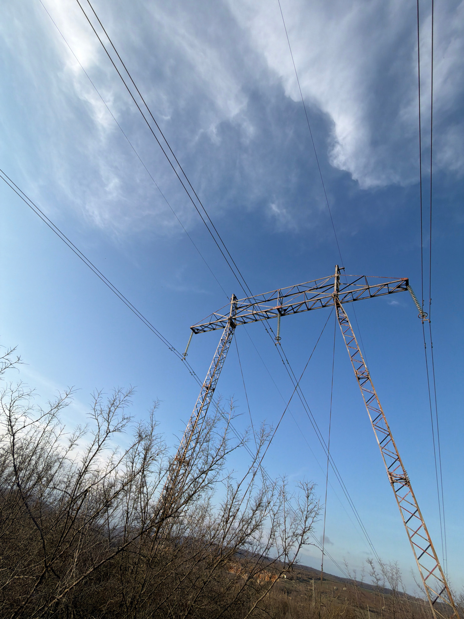 The image shows a low-angle view of a metal lattice electricity pylon against a backdrop of a light blue sky with scattered clouds. Several high-voltage power lines stretch across the frame. To the ri…read more