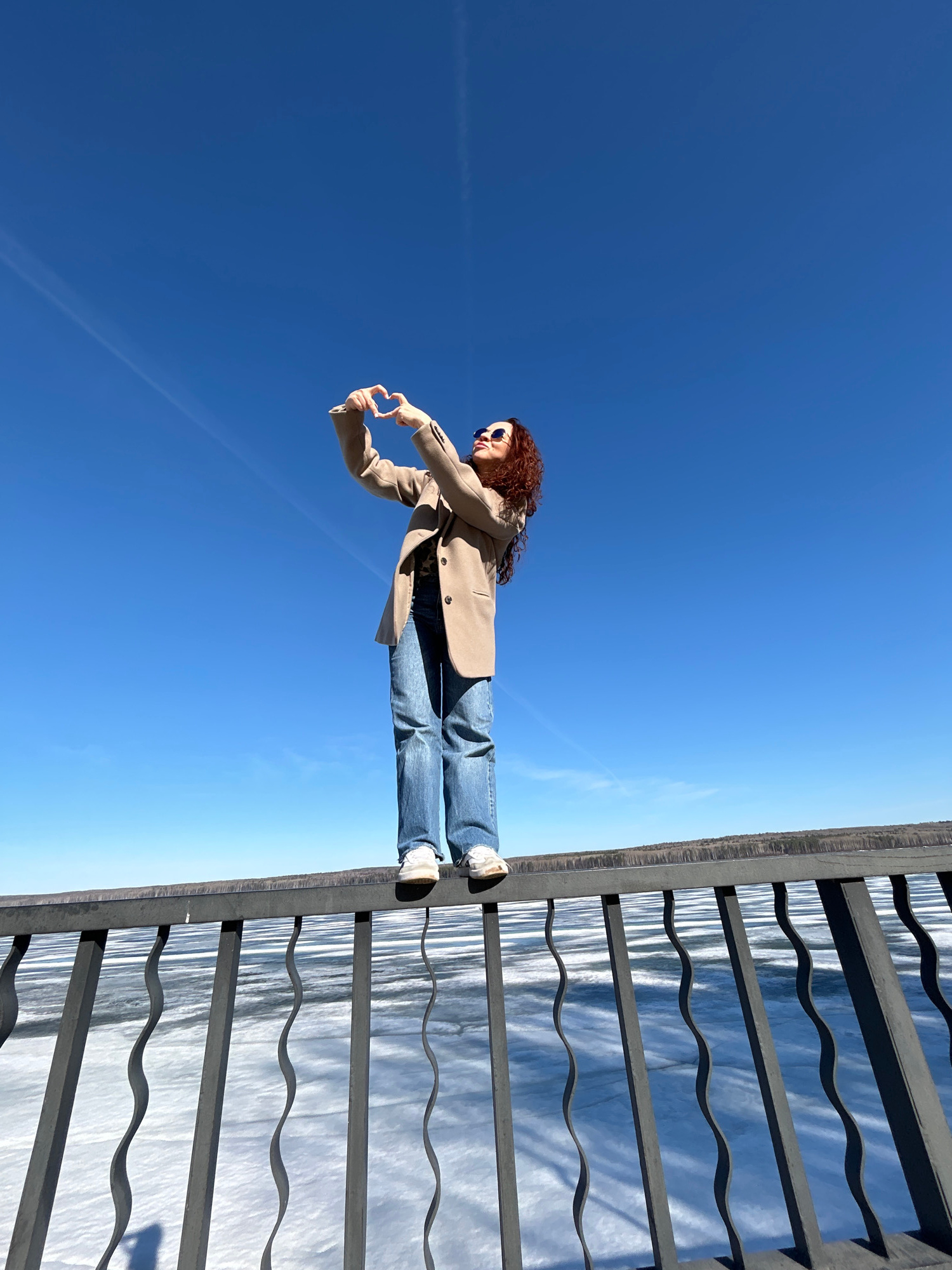 A vibrant outdoor, full-length shot captures a person standing next to a body of water under a clear blue sky in Chaikovsky, Russia. The individual, appearing to be female, has curly reddish-brown hai…read more