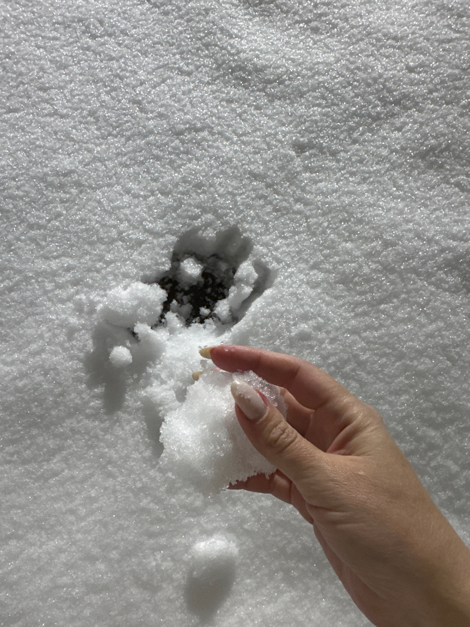 A fair-skinned hand with long nails is holding a clump of snow over a bare patch of earth in a snowy field. A shadow is cast behind the hand. The location is speculated to be near Вассята, Russia.