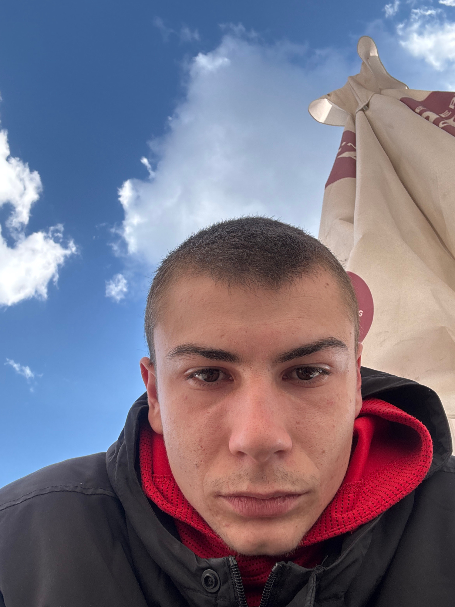 The image is a selfie of a man with short hair, brown eyes, wearing a black jacket with a red hoodie underneath. The background is a blue sky with white clouds and part of a tan-colored umbrella. The…read more