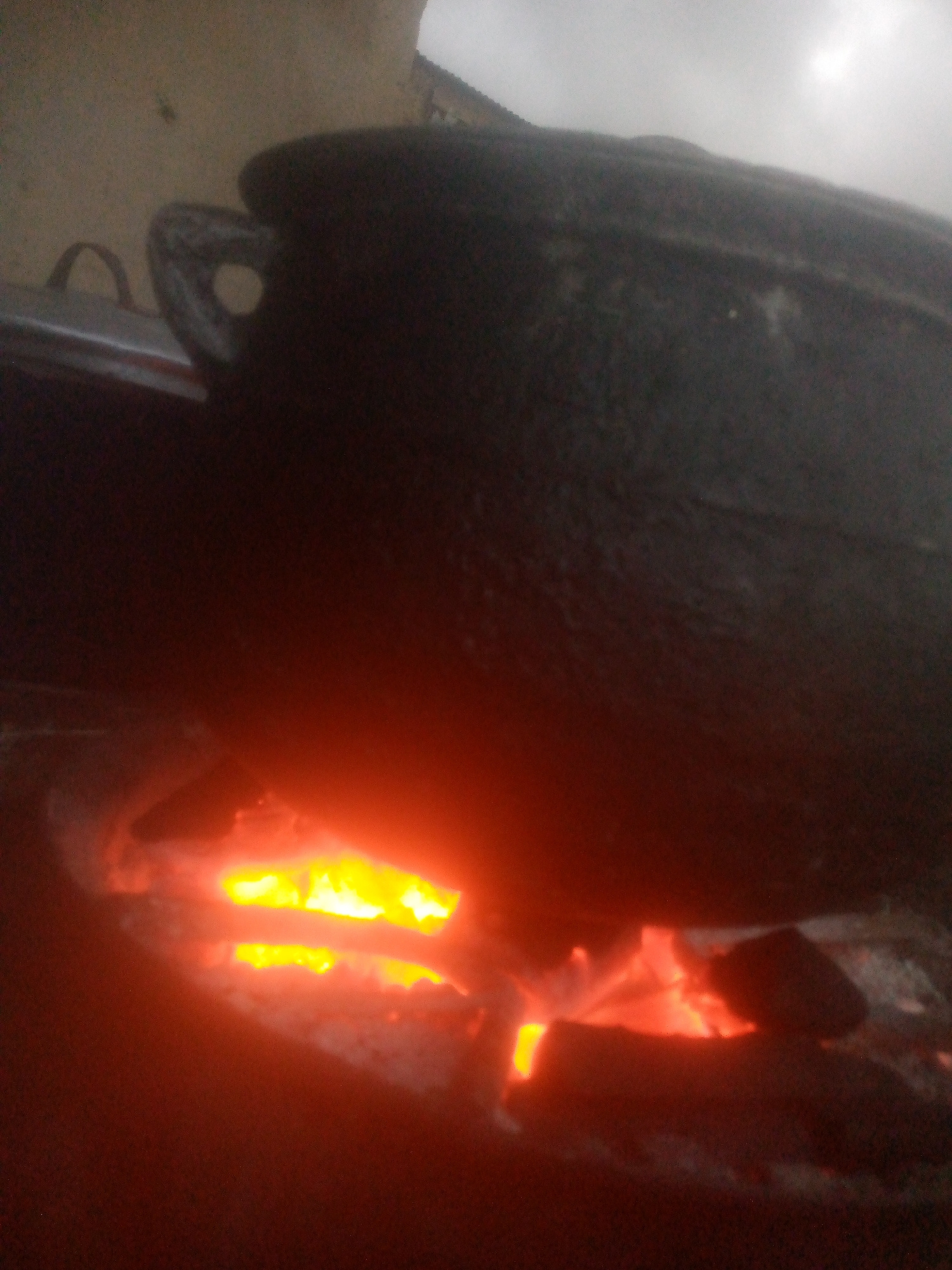 A black cast iron pot sits on a wood fire. The fire glows orange and yellow, illuminating the bottom of the pot and the surrounding area. The pot has a handle with a hole in it, visible on the left si…read more
