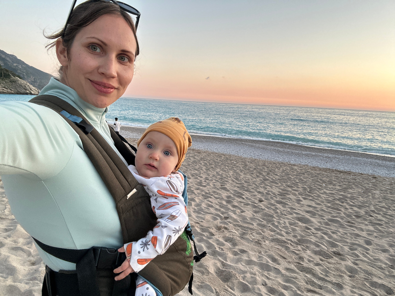 A woman is carrying a baby in a carrier while standing on a beach. The baby has blue eyes, a tan hat, and a white shirt with a surf board pattern. The woman has light skin, light eyes, and dark hair,…read more
