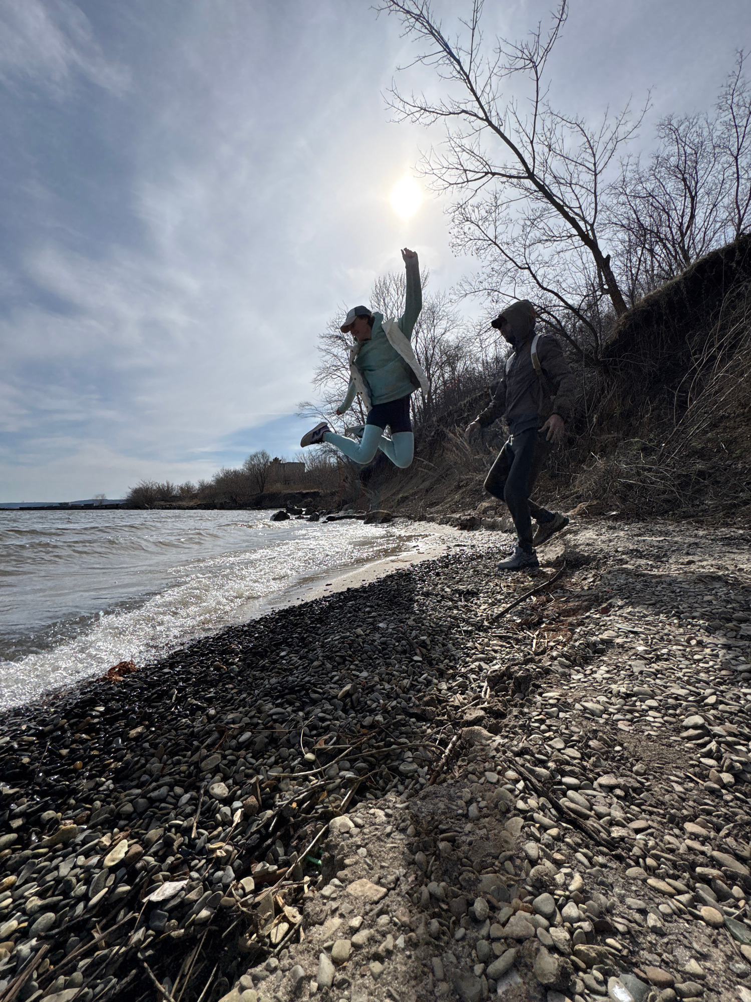 The image captures an active outdoor scene along a pebbly riverbank in Ulyanovsk, Russia, under a bright daytime sky. The perspective is low, looking upwards towards the sky and the sun. In the mid-g…read more