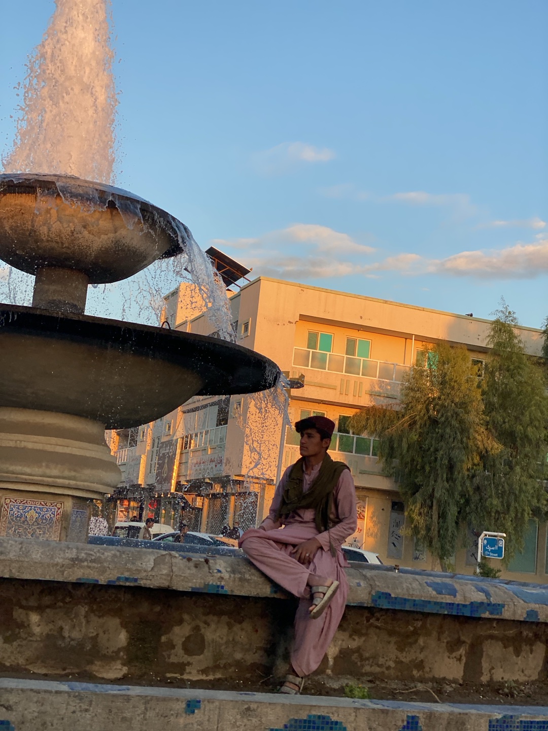 A young man sits on the edge of a fountain in what appears to be Kandahar, Afghanistan. The man is wearing traditional attire, a long pink dress, a scarf, and sandals. He also has a Pakol hat on. The…read more