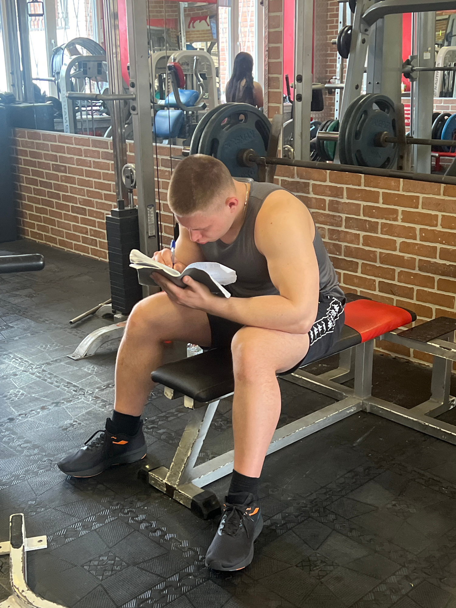 A young adult male sits on a weight bench in a gym, holding and writing in a notepad with a pen. He is wearing a gray tank top, black Kappa shorts, and black athletic shoes with orange accents. The gy…read more