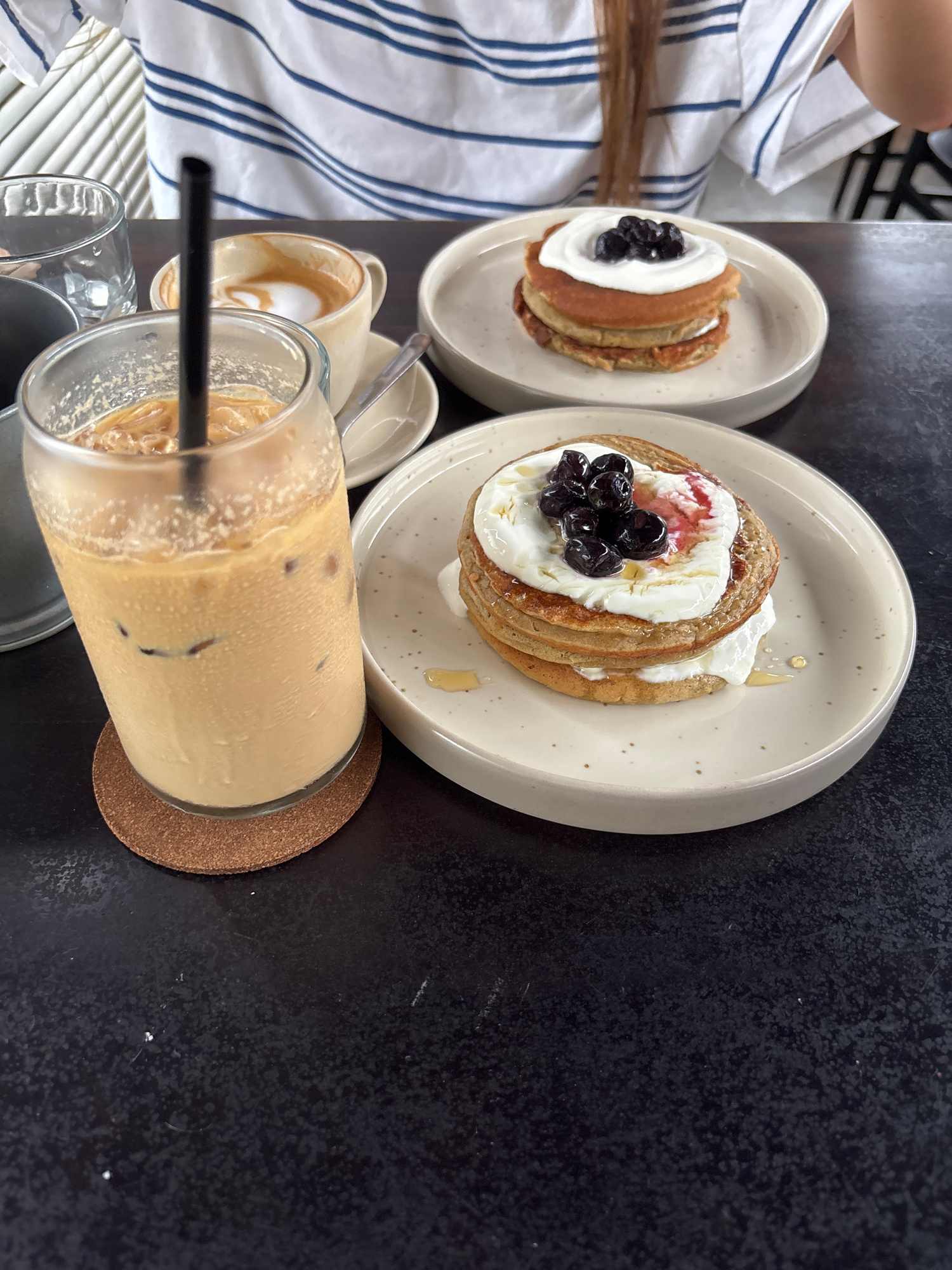 The image presents an overhead view of a cafe table set with breakfast or brunch items in Kuta Selatan, Indonesia. The dark, textured tabletop holds two plates of pancakes, an iced coffee, and other b…read more