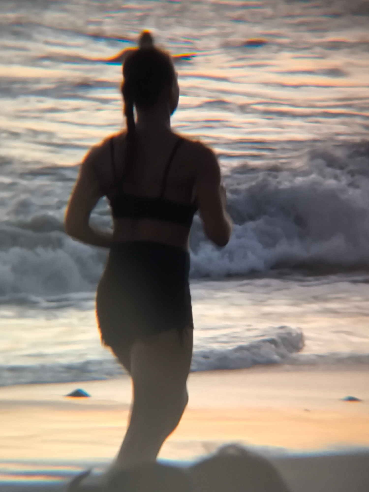 A woman with her hair in a ponytail is running along the beach, facing away from the camera. She is wearing a black sports bra and black shorts. The beach setting includes sand and breaking waves. The…read more