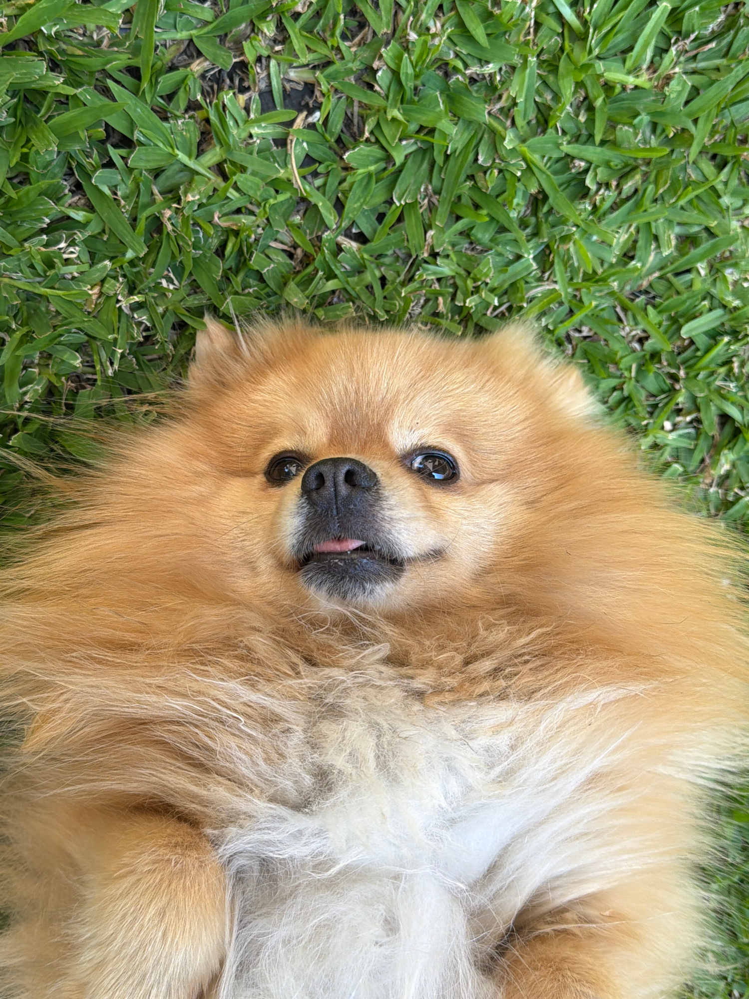 A fluffy, light-brown Pomeranian dog is lying on its back on green grass. The dog's head is visible, with its black nose and a small pink tongue sticking out. The dog's eyes are looking towards the ca…read more