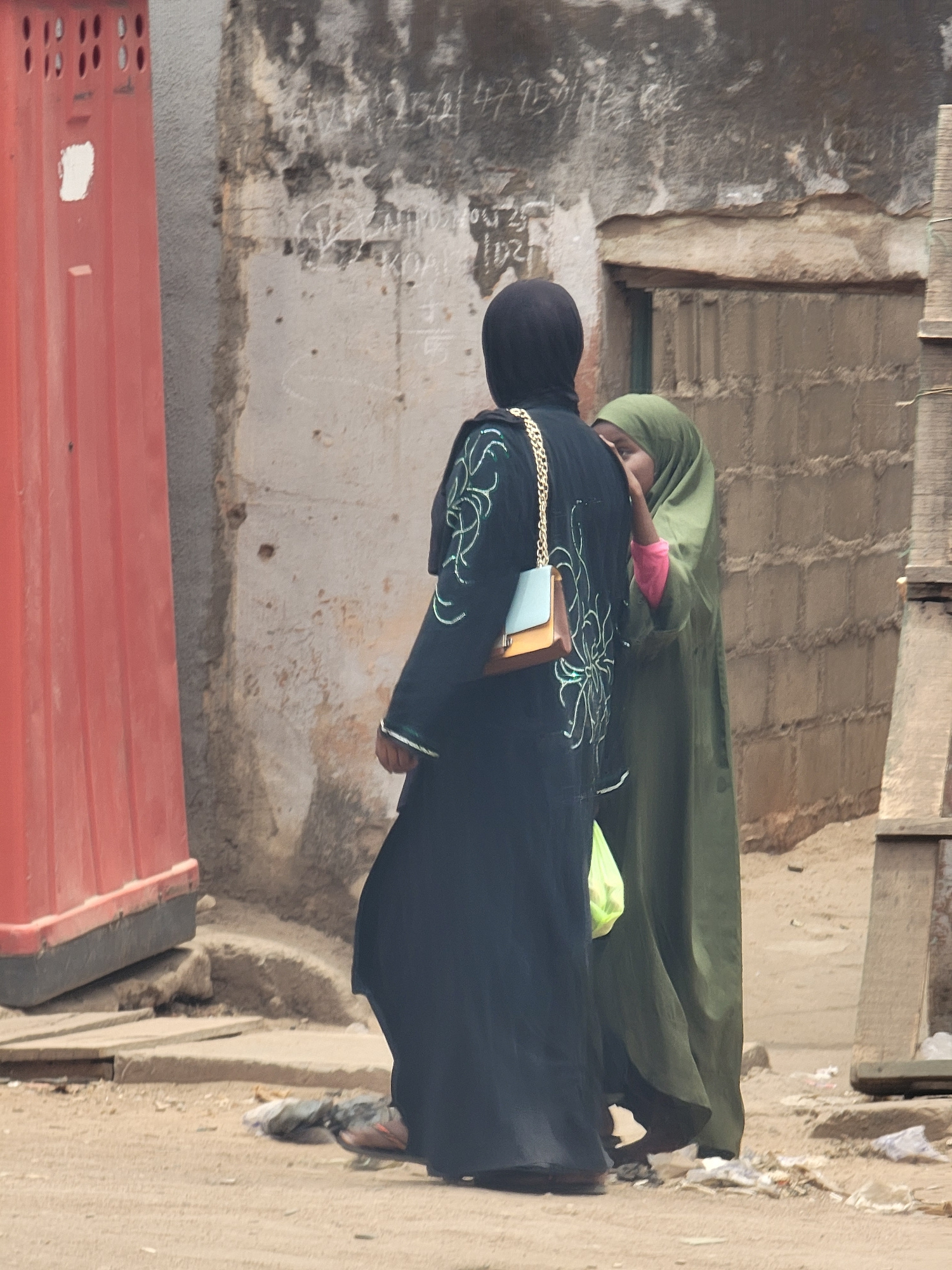 Two individuals are present in an outdoor setting in Maiburiji, Nigeria. One person wears a black abaya with embroidered details and a black head covering. The second person is dressed in green garmen…read more
