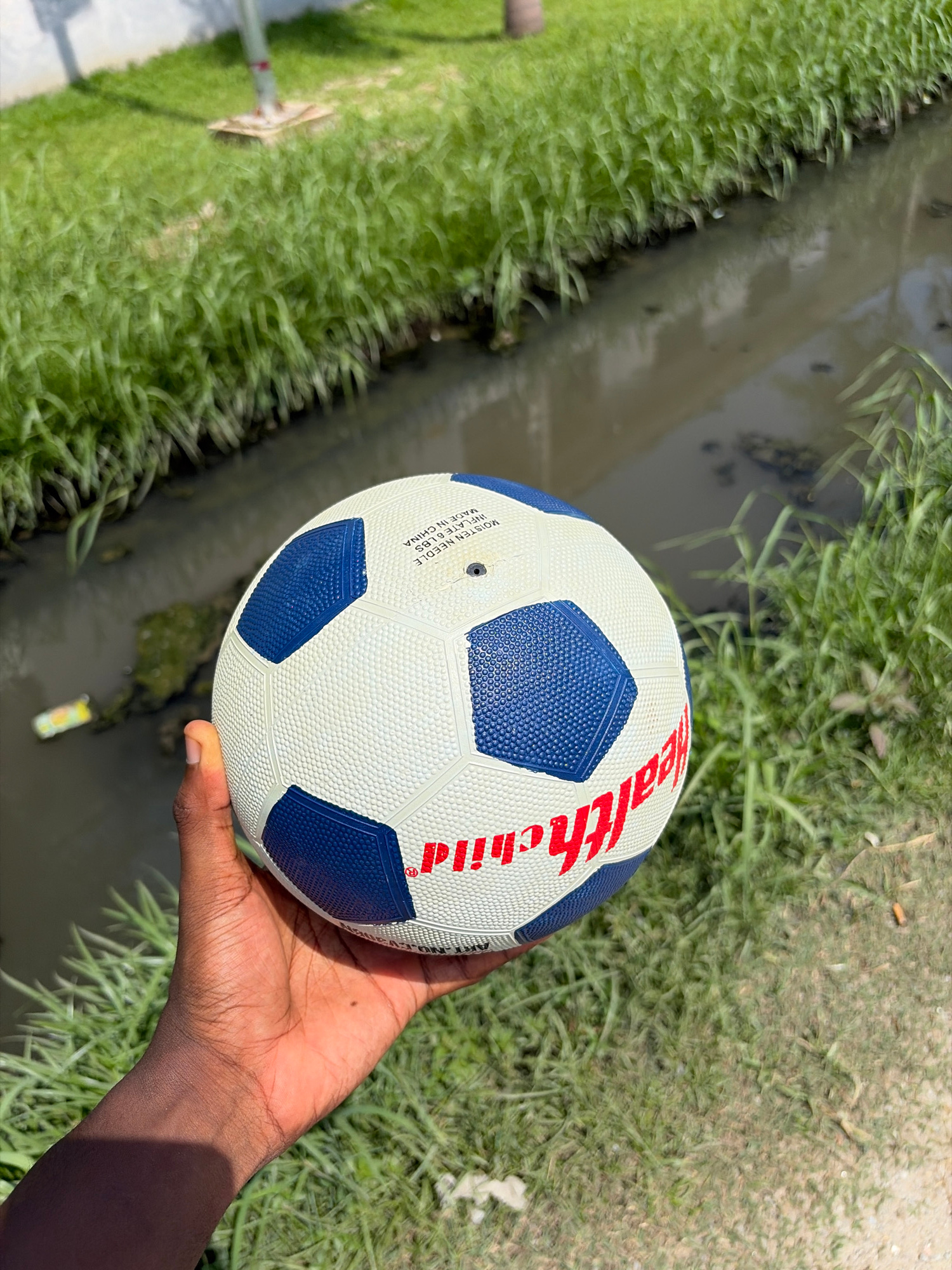 The image shows a person holding a blue and white soccer ball with red lettering that reads "healthchild" in their right hand. The ball is positioned in front of a grassy area adjacent to a narrow str…read more