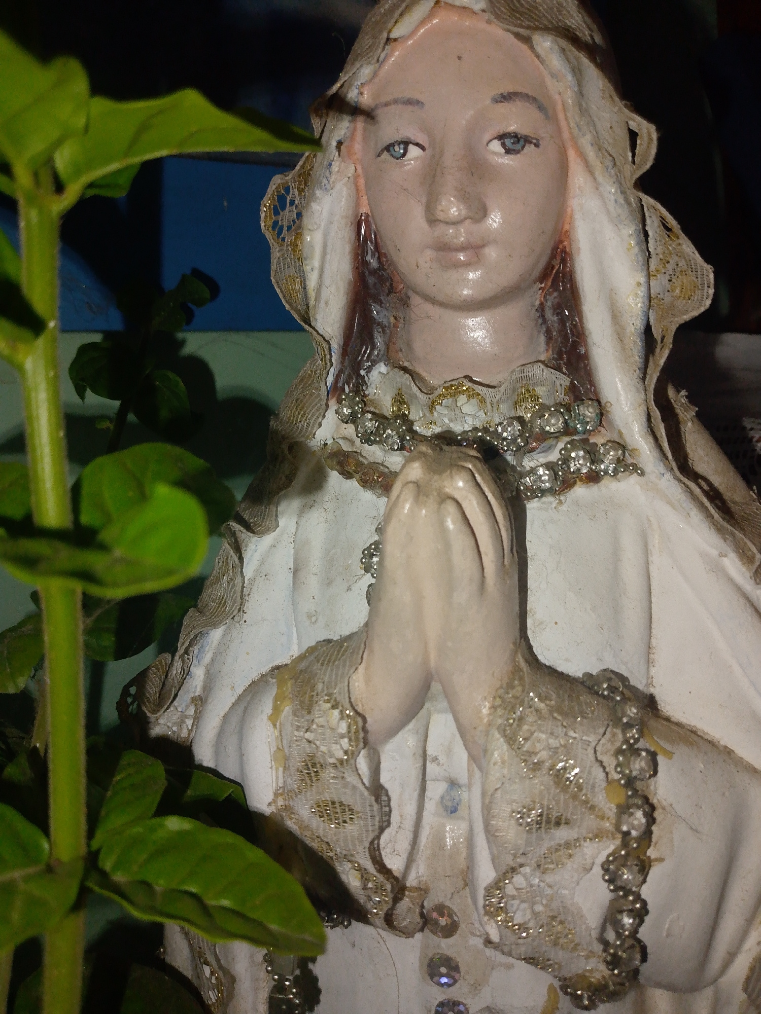 A statue of the Virgin Mary stands prominently in the frame, her hands clasped in prayer. She wears a white robe trimmed with lace and adornments. A green plant is partially visible on the left, addin…read more