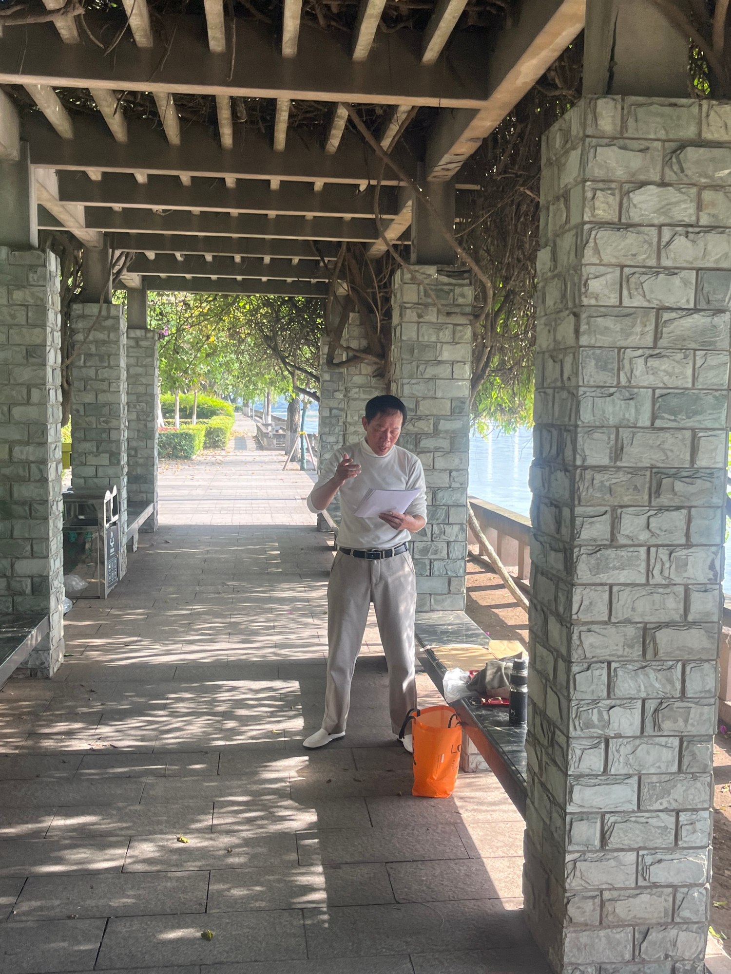 The image, correctly oriented, shows a man standing on a paved outdoor pathway under a stone and trellis structure in Jiangjin, China, on a bright, sunny day. The central subject is an East Asian man…read more