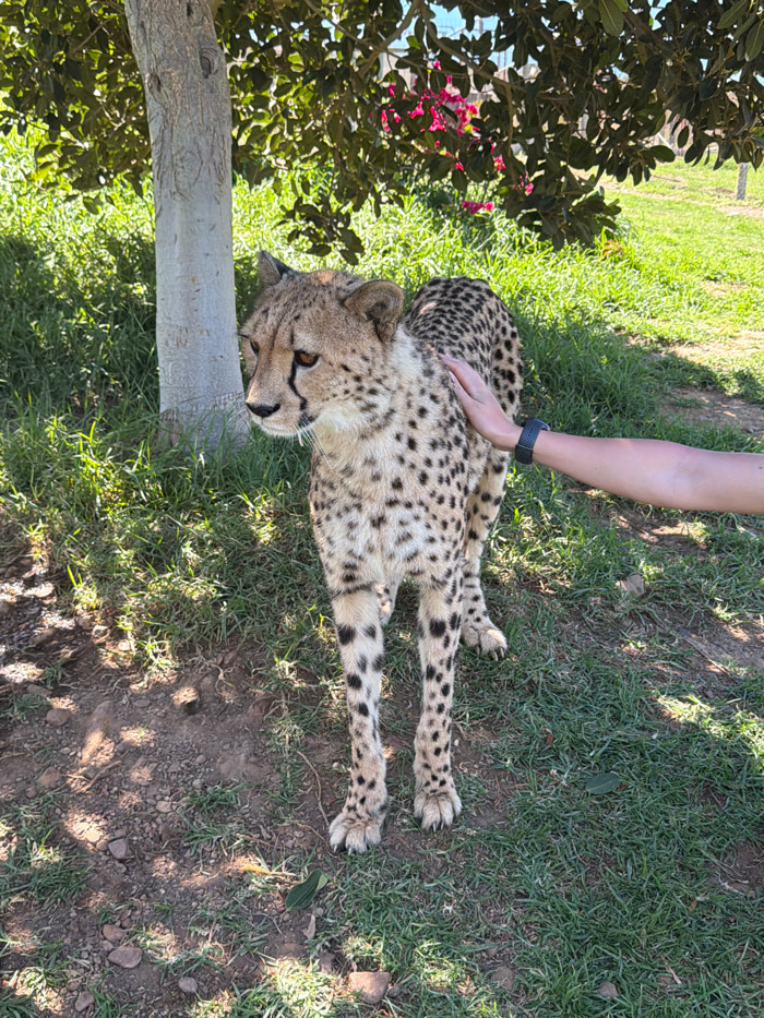 In the city of Theewaterskloof Nu, South Africa, a cheetah stands centered on a sunlit patch of ground composed of grass and reddish-brown dirt. The animal, exhibiting a fawn-colored coat with distinc…read more