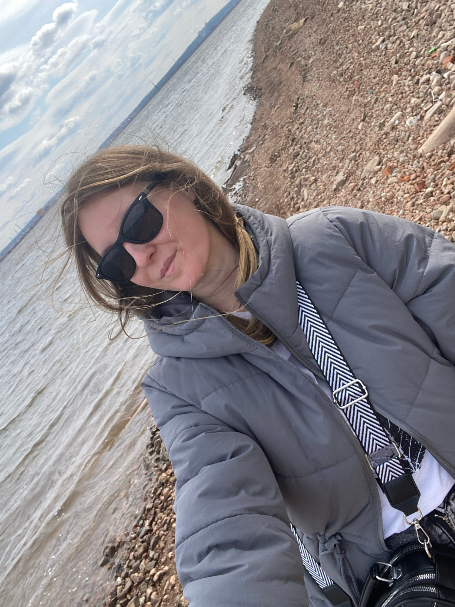 A person, likely a young woman, is captured in a close-up outdoor shot, posing for the camera. She has long, light brown hair, partially obscured by dark, square-framed sunglasses that cover her eyes.…read more
