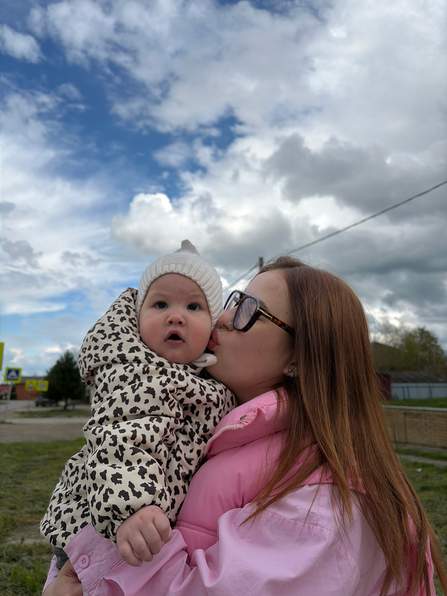 A woman is kissing a baby in Novopokrovskaya, Russia. The woman has long brown hair and is wearing glasses and a pink jacket. The baby is wearing a white hat and a beige leopard-print jacket. They are…read more