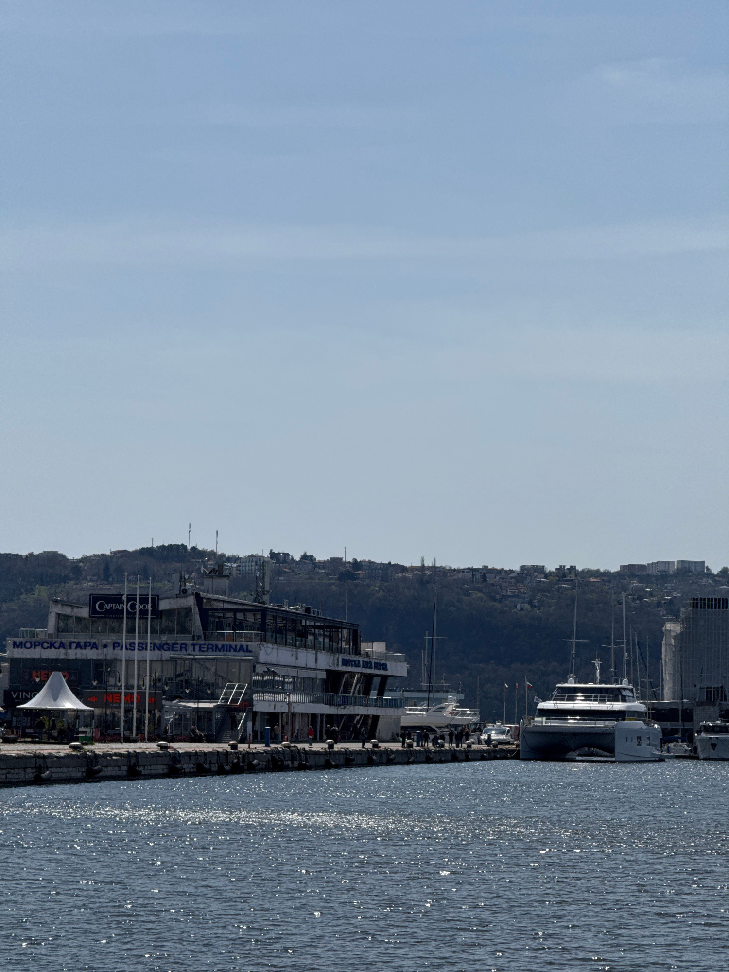 The image shows a view of the Varna harbor in Bulgaria on a sunny day. The right side features a large body of water with visible sun glint. Adjacent to the water, along the harbor, is a pier with sev…read more