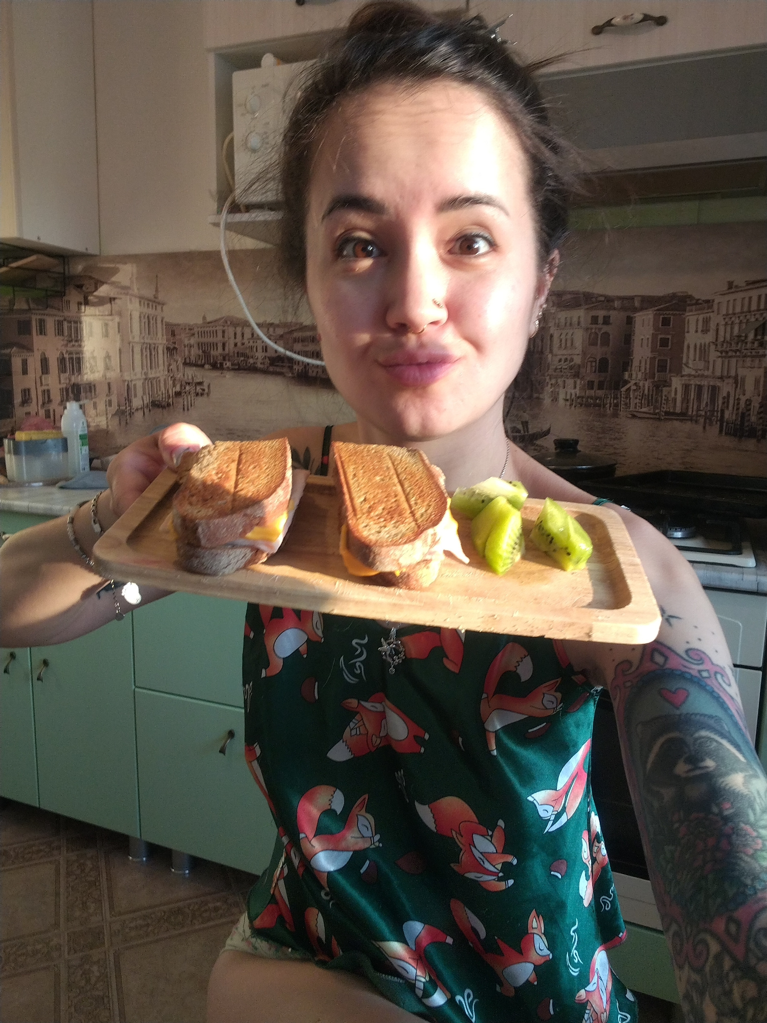 A woman is holding a wooden tray containing two sandwiches and cut kiwis. She is indoors, likely in a kitchen, with cabinets and a countertop visible in the background. The wallpaper behind her featurโฆread more