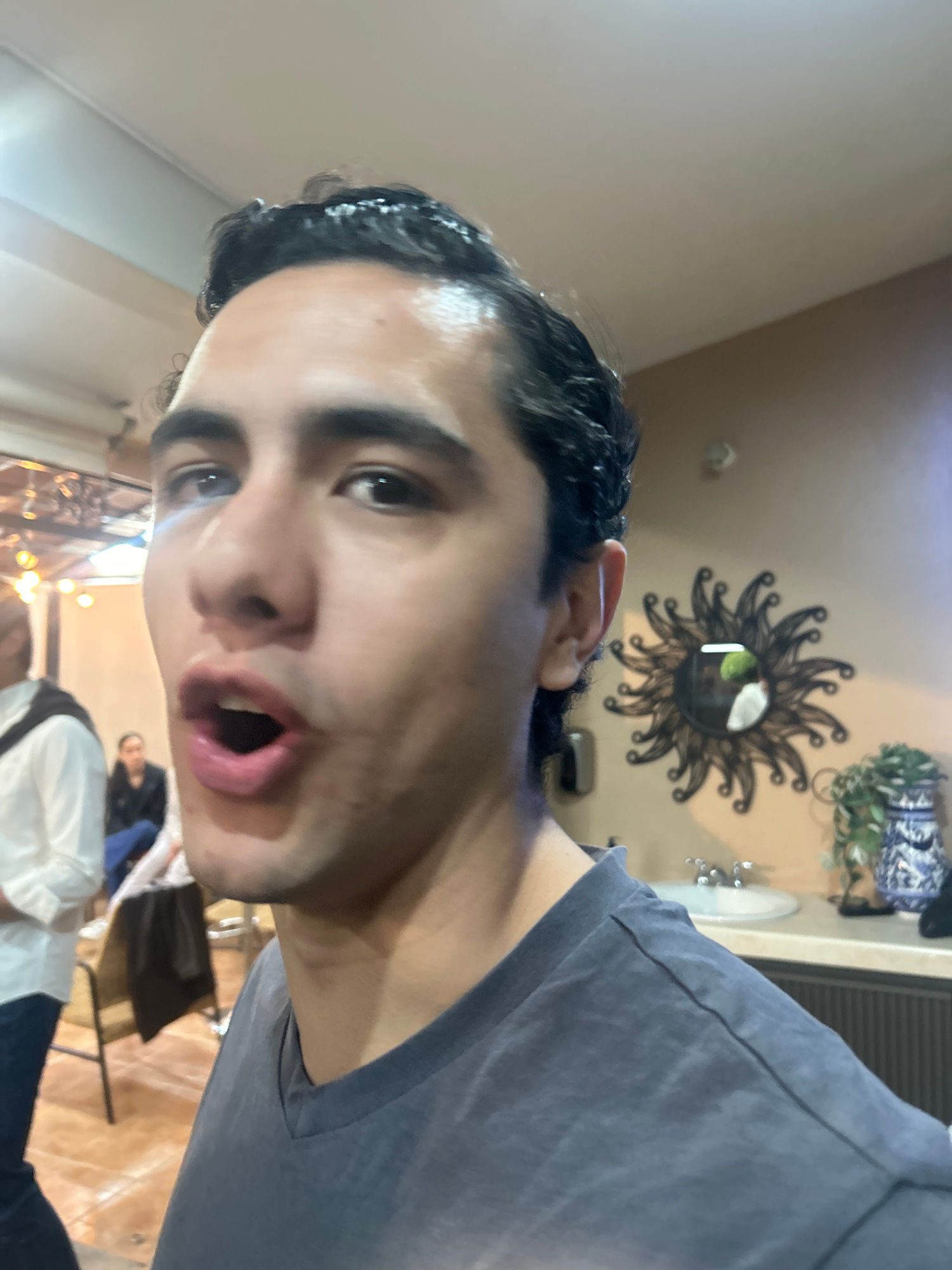 A close-up, angled shot depicts a person with dark hair and light skin looking directly at the camera with an open mouth expression. The person is wearing a gray shirt. In the blurred background, ther…read more