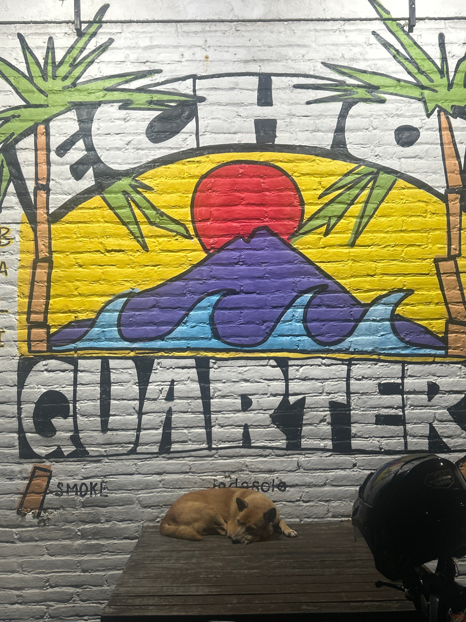 The image shows a mural on a brick wall in North Kuta, Indonesia. The mural depicts a stylized scene with palm trees, a red sun, and a purple and blue shape against a yellow background. The word "GUA"…read more