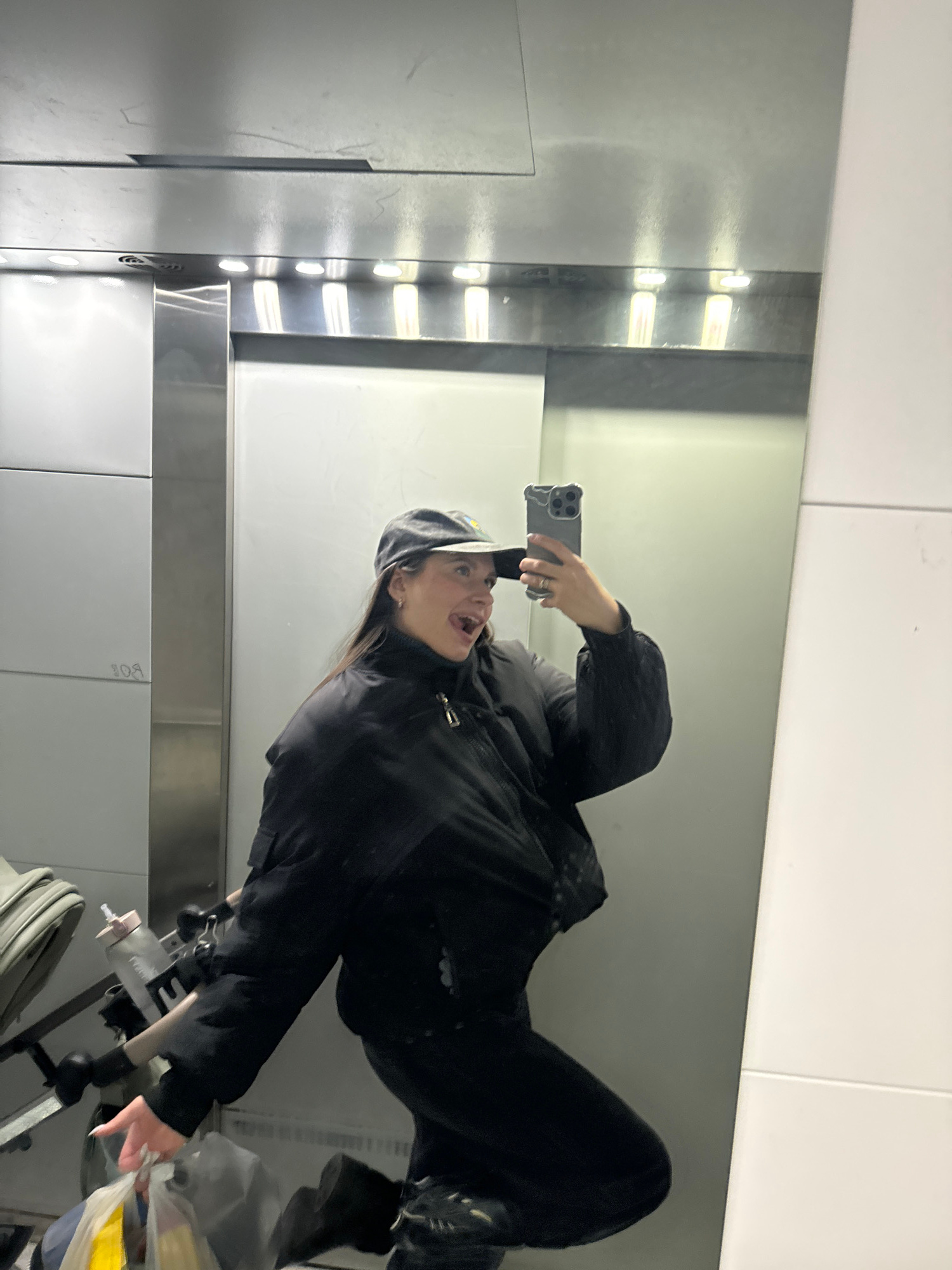A woman is seen in a mirror, taking a selfie with her phone. She is wearing a black jacket and a cap. The reflection shows a public bathroom with white tiled walls and fluorescent lighting. In the for…read more