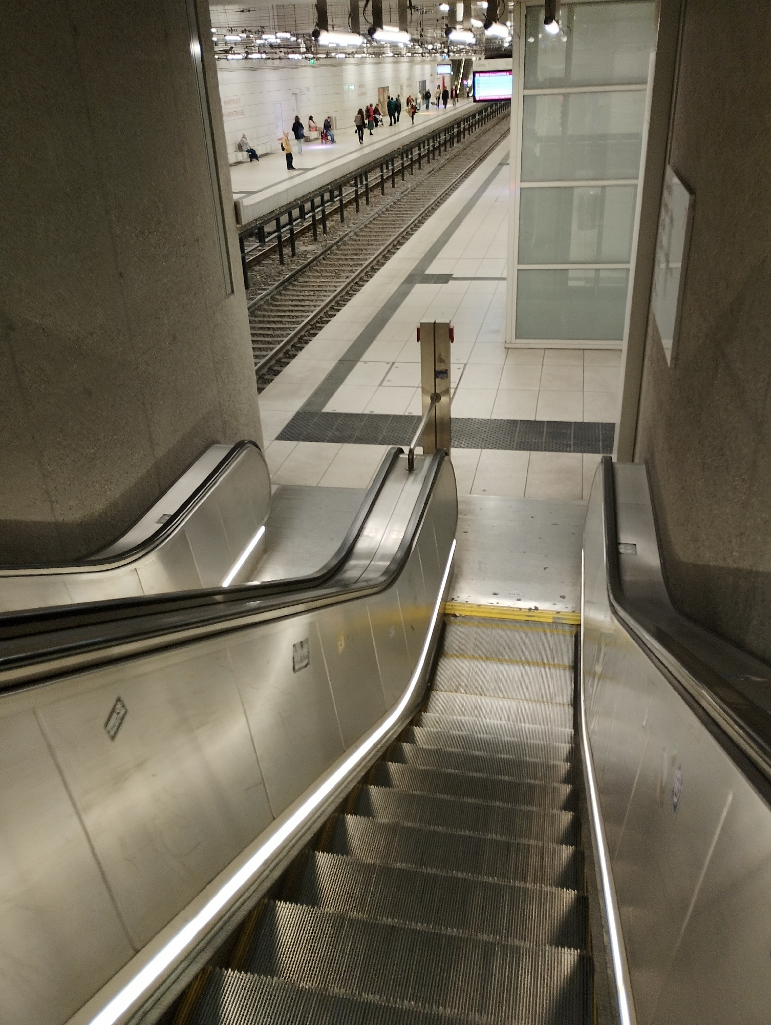 The image depicts an escalator descending into a subway station. The platform is visible, with tracks running along it, and a number of people standing and walking on the platform. The station appear…read more