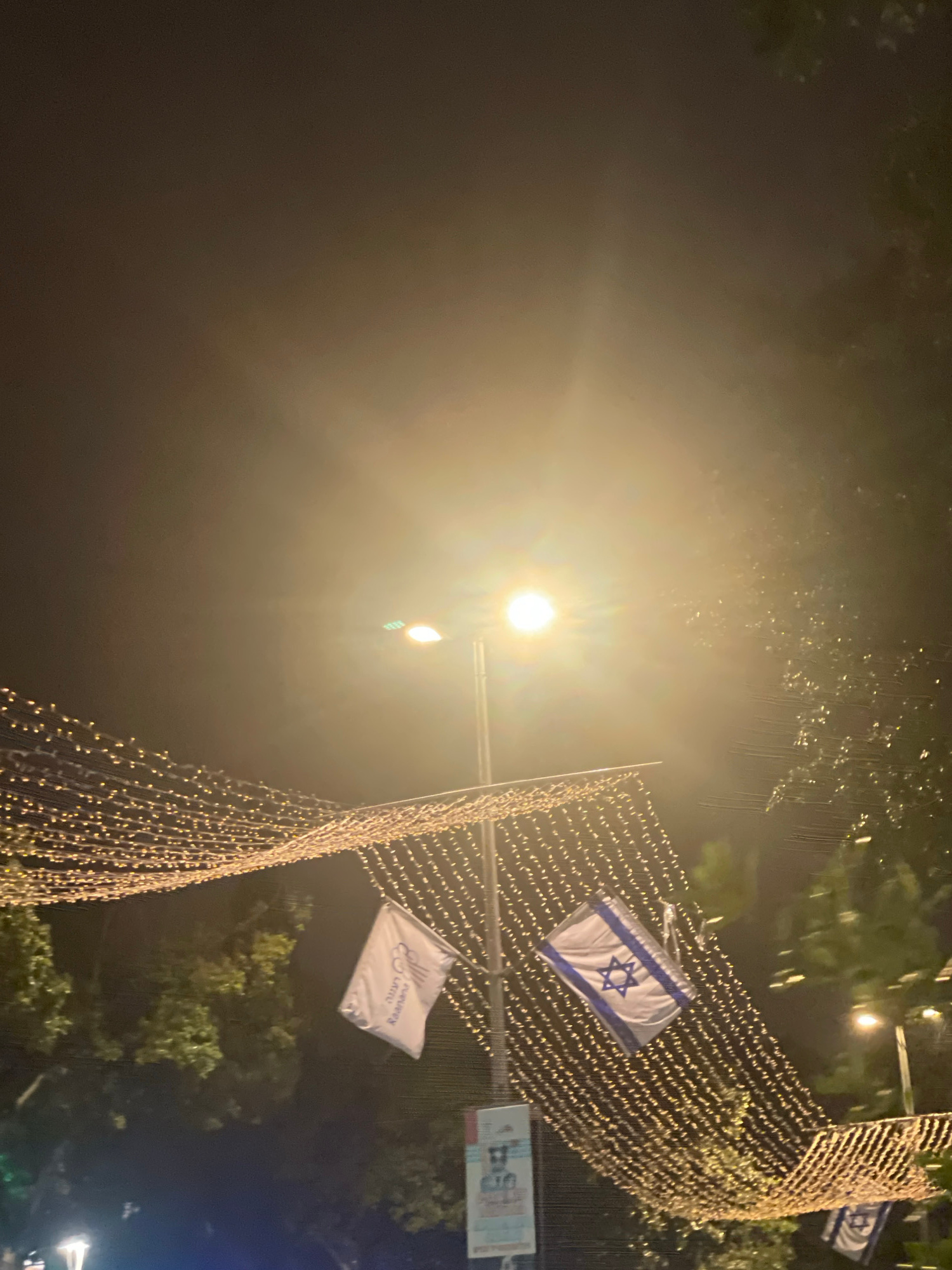 At night, the city of Raanana, Israel is adorned with strings of lights, complemented by Israeli flags displayed along the streets. Streetlights cast bright illumination onto the scene. The environmen…read more