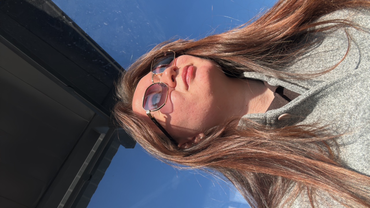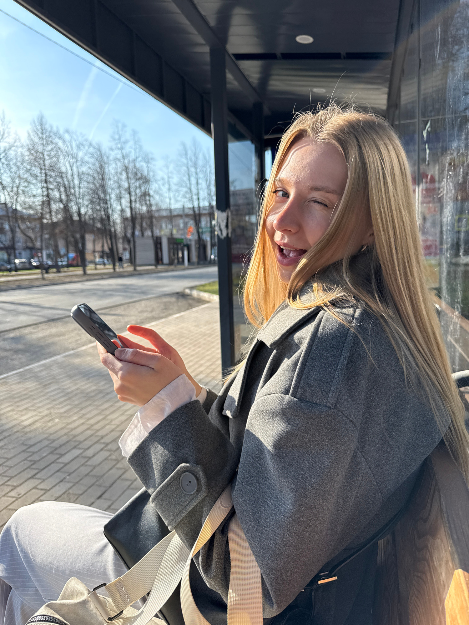 A young woman with long blonde hair is sitting at a bus stop in the city of Chaikovsky, Russia. She is wearing a gray coat over a white shirt and light-colored pants. She has a bag with a beige strapβ¦read more
