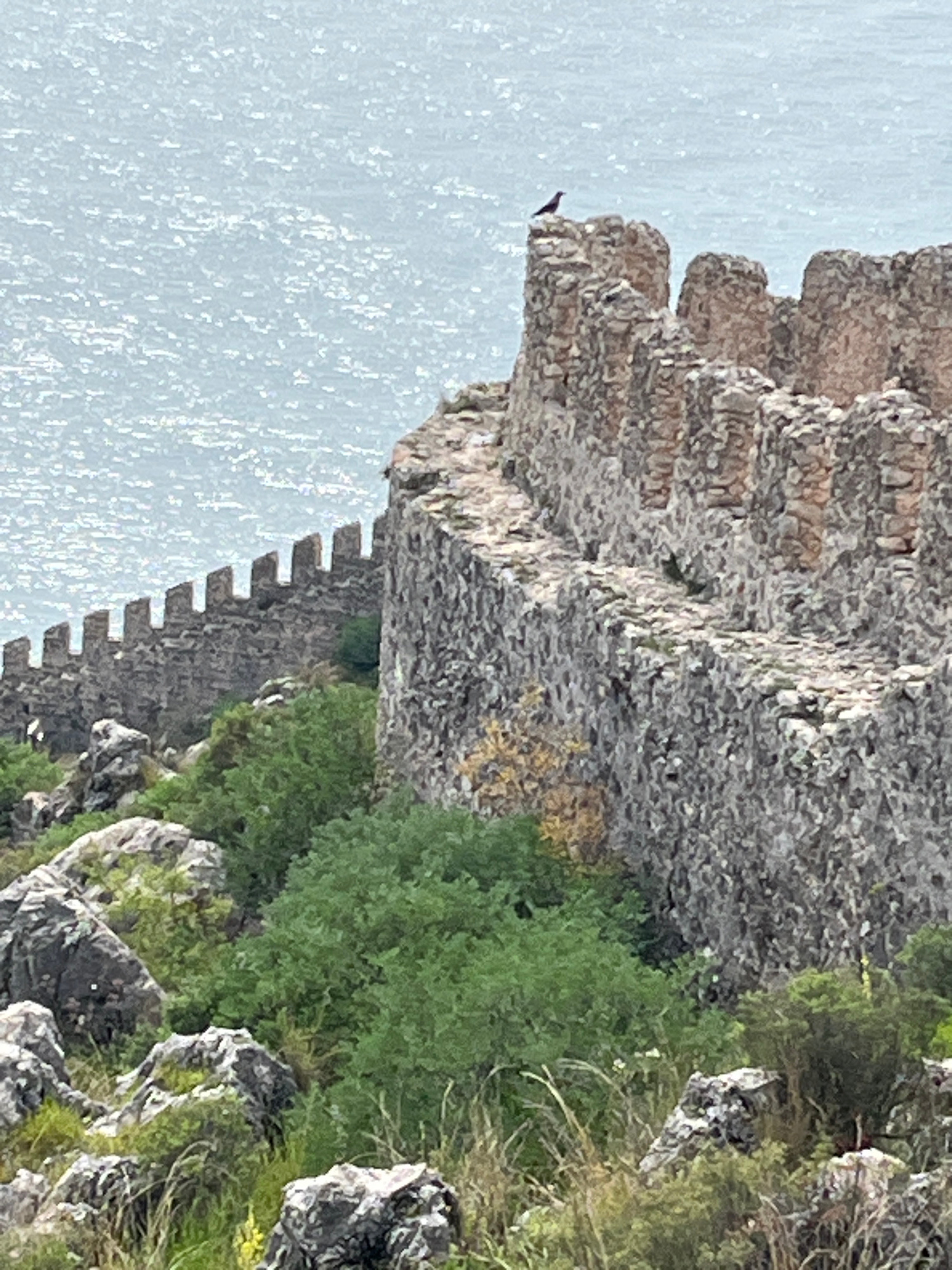 The image displays a section of the Alanya Castle walls, located on the historic Alanya Peninsula in Alanya, Turkey. Ancient stone walls, constructed from irregular light brown and gray stones, featur…read more