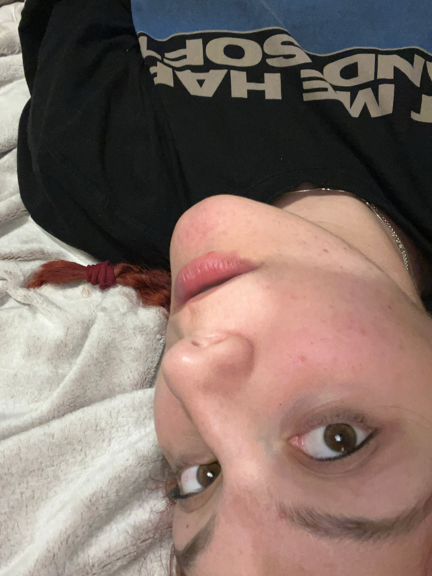 A close-up, slightly angled portrait shows a person with fair skin and brown eyes lying on a soft, textured, light-colored surface (likely a blanket or bedding). The person has auburn hair, with a sma…read more