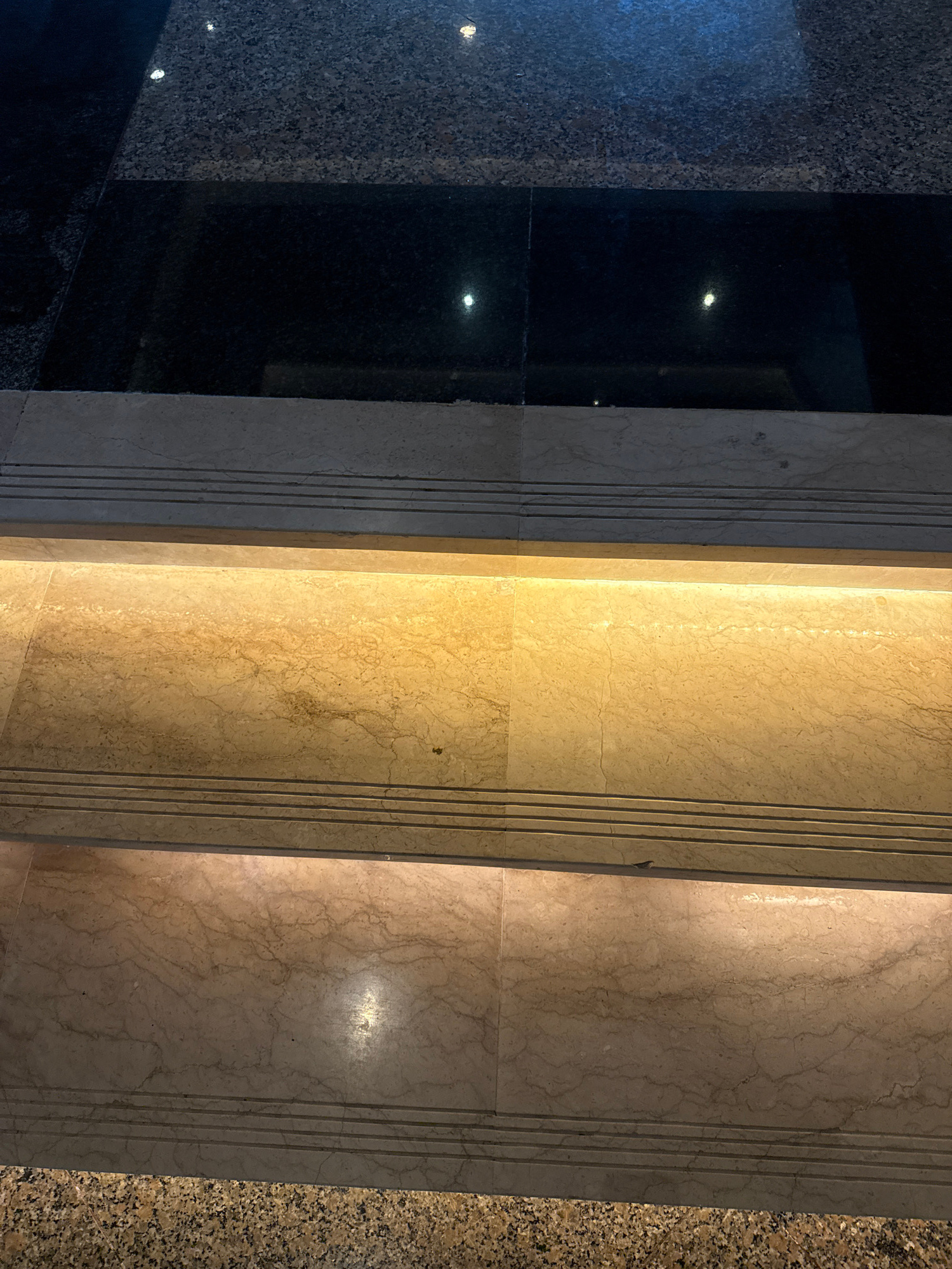 A close-up, slightly angled view shows a series of adjacent stone surfaces, possibly cladding or flooring, in Nusa Dua, Indonesia. The left side features a dark, reflective stone, interspersed with a…read more