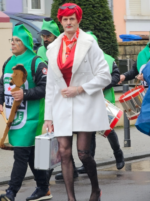 The image depicts an outdoor festive event, likely a parade or carnival, featuring several individuals in costumes. The scene appears to be set on a paved street or sidewalk during daylight hours, wit…read more