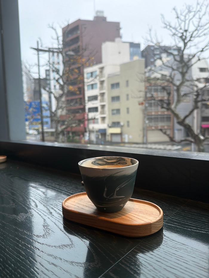 A cup of coffee with marbled dark green and white designs sits on a wooden saucer, placed on a dark textured surface, possibly a table. Outside the window, buildings are visible on a cloudy day with b…read more