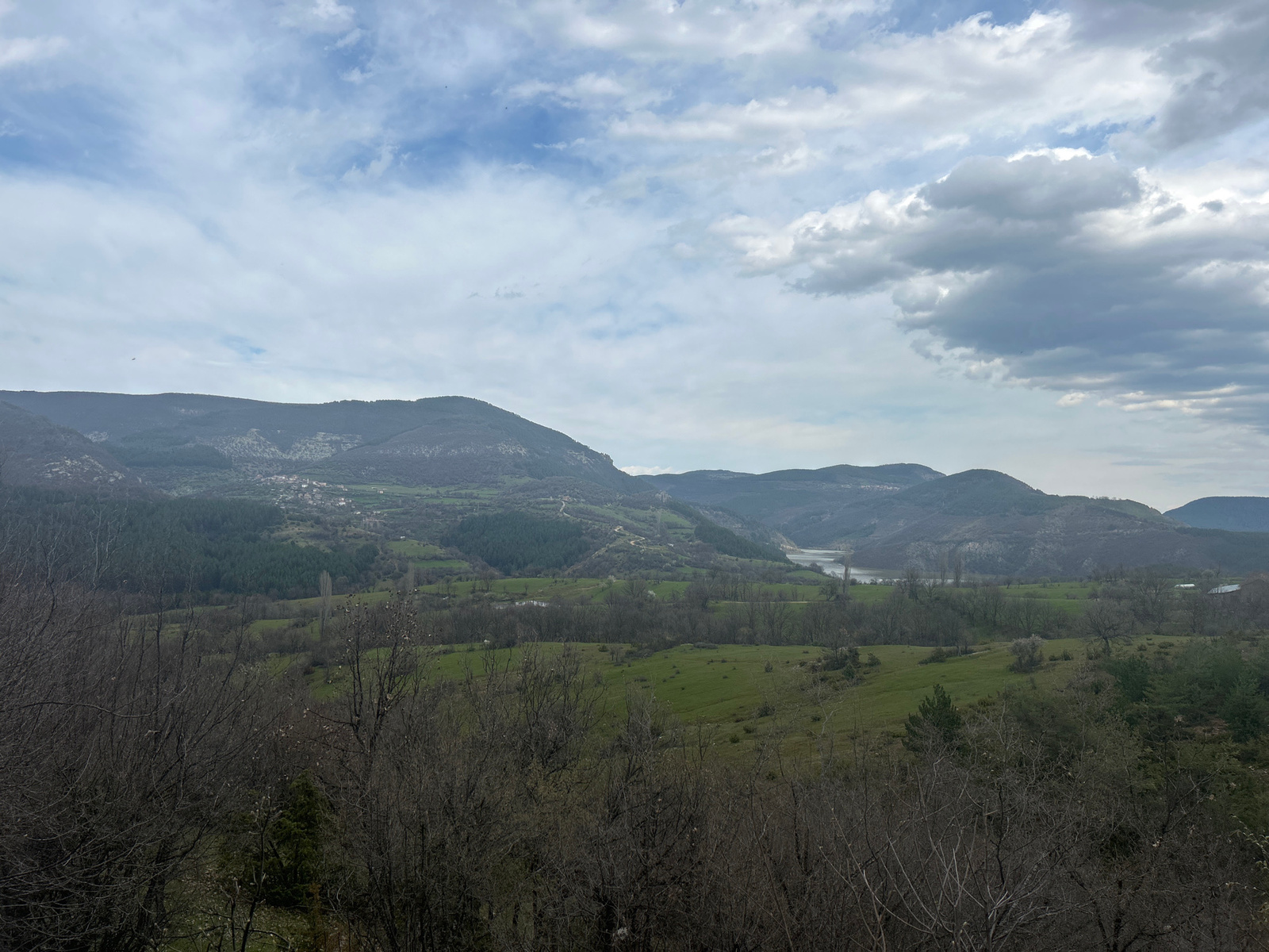 The image shows a landscape in Ribartsi, Bulgaria. Rolling hills covered in green fields and forests dominate the scene. In the distance, a lake or river curves through the landscape. A small village…read more
