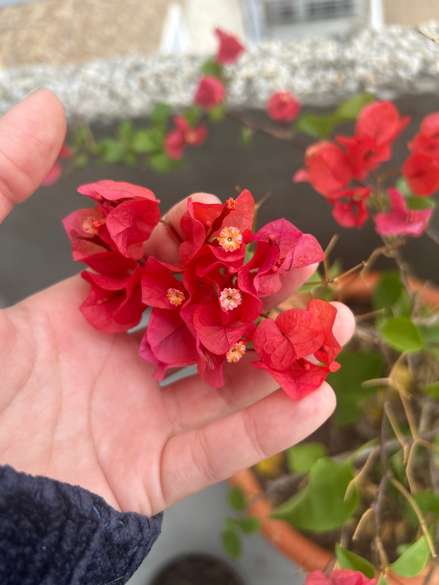 A person's hand holds a cluster of red bougainvillea flowers. The flowers have papery petals and small white or yellow centers. The background includes more bougainvillea in the distance, as well as a…read more