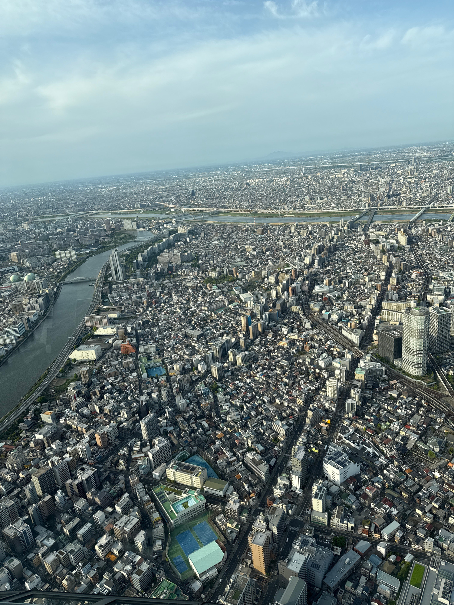 The vertically oriented image presents an expansive aerial view of a densely populated urban landscape, consistent with Sumida, Japan, under a light blue, hazy sky. The upper left portion of the frame…read more