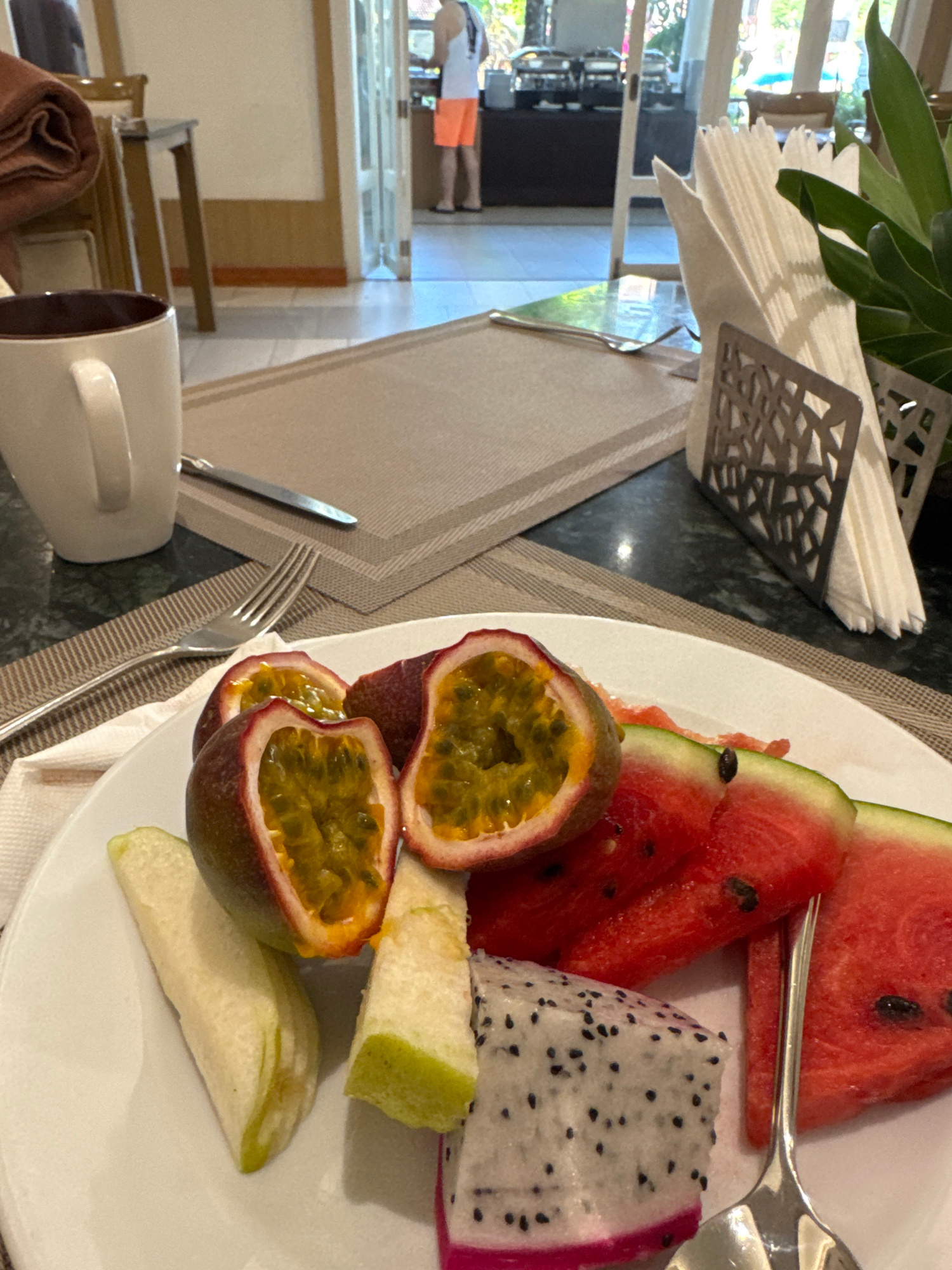 Here is a forensic description of the image: **Scene:** An indoor setting, likely a restaurant or dining area in Patong, Thailand. **Objects:** * A white plate containing a variety of cut fruits:…read more