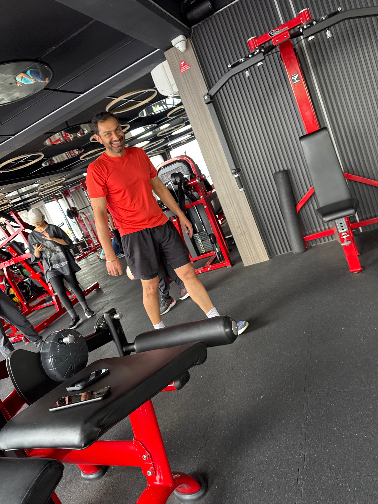 The image captures an indoor scene inside a modern gym or fitness center. The primary subject is a man standing in the foreground, facing and smiling directly at the camera. He wears an orange-red sho…read more