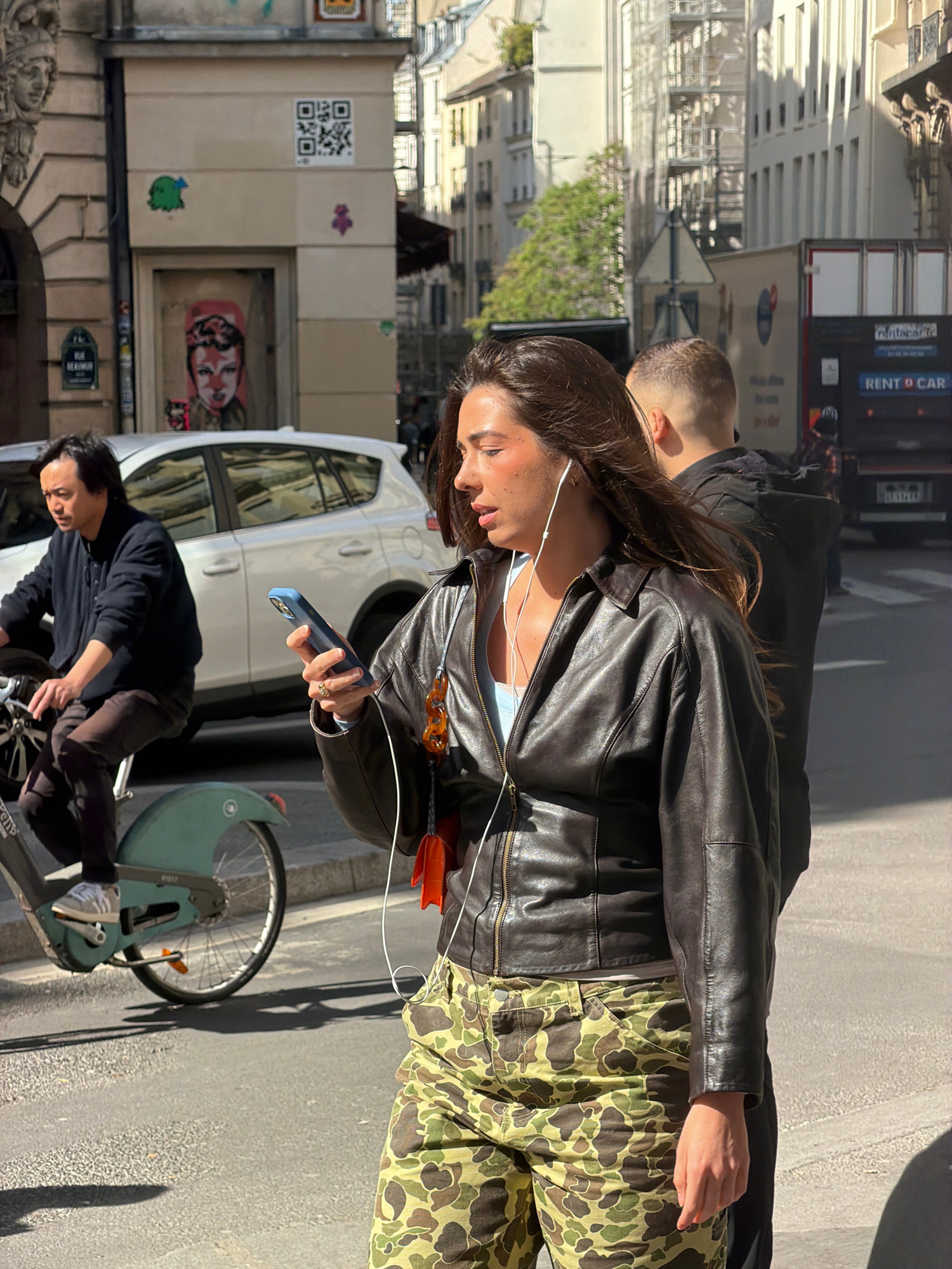 A woman wearing a black leather jacket and camouflage pants is standing on a street in Paris, France, holding a blue smartphone in her left hand. She has earphones in her ears. Next to her is a man's…read more