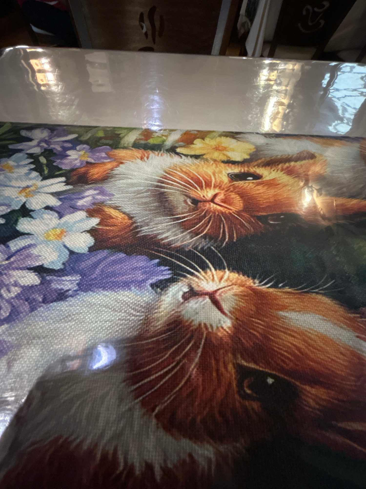 The image shows a close-up of a framed print featuring two brown rabbits among purple and white flowers. The print is still wrapped in plastic, reflecting light. A wooden structure is partially visibl…read more