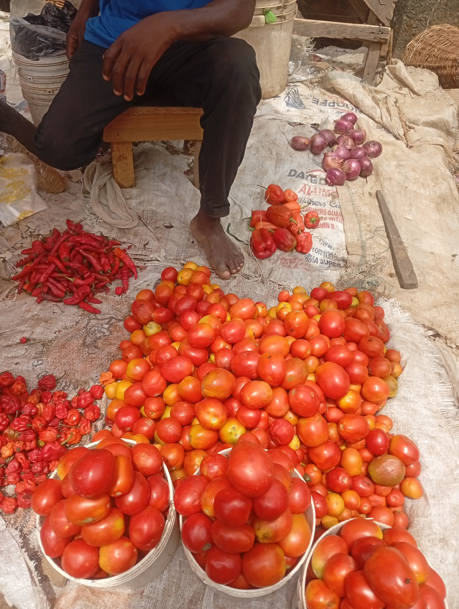 A street vendor sits on a wooden stool at an outdoor market in Sabon Tasha, Nigeria. Piles of red tomatoes dominate the foreground, some contained in white plastic buckets. To the left of the tomatoes…read more