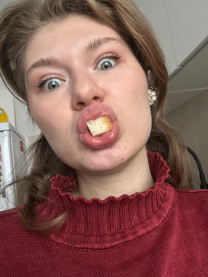 An indoor, close-up, head-and-shoulders portrait depicts a fair-skinned female, approximately 20-30 years old, with light brown hair, wide blue eyes, and light makeup, including defined eyeliner. Her…read more