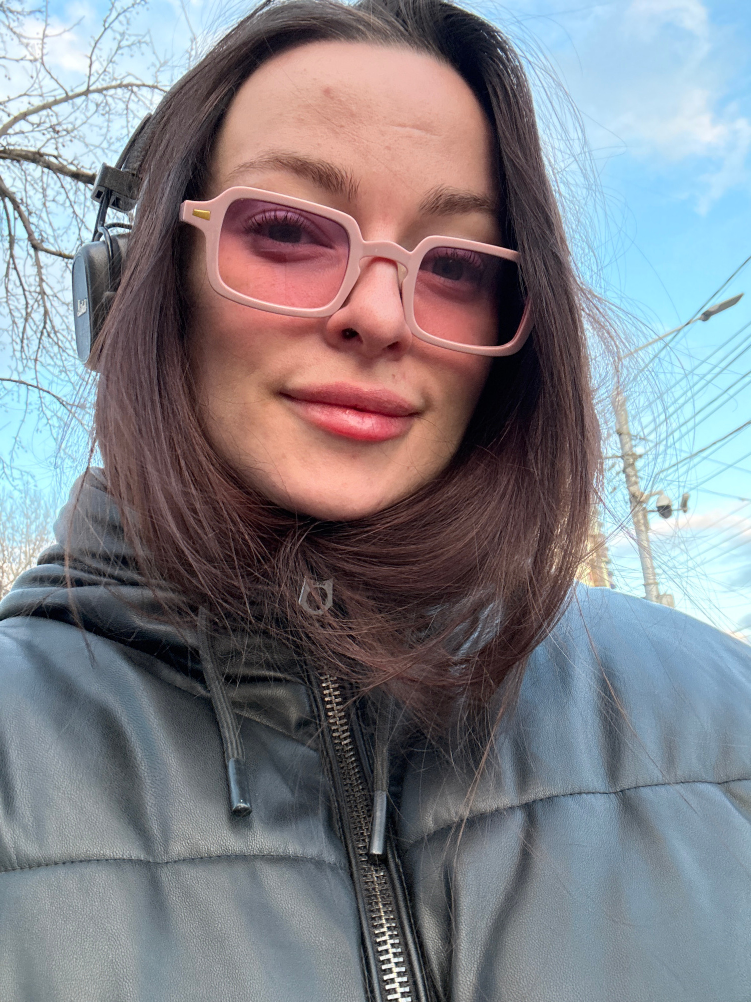 The image is a close-up, low-angle selfie of a young woman taken outdoors. She has dark brown hair and is looking directly at the camera with a neutral expression, her lips slightly parted. She is wea…read more