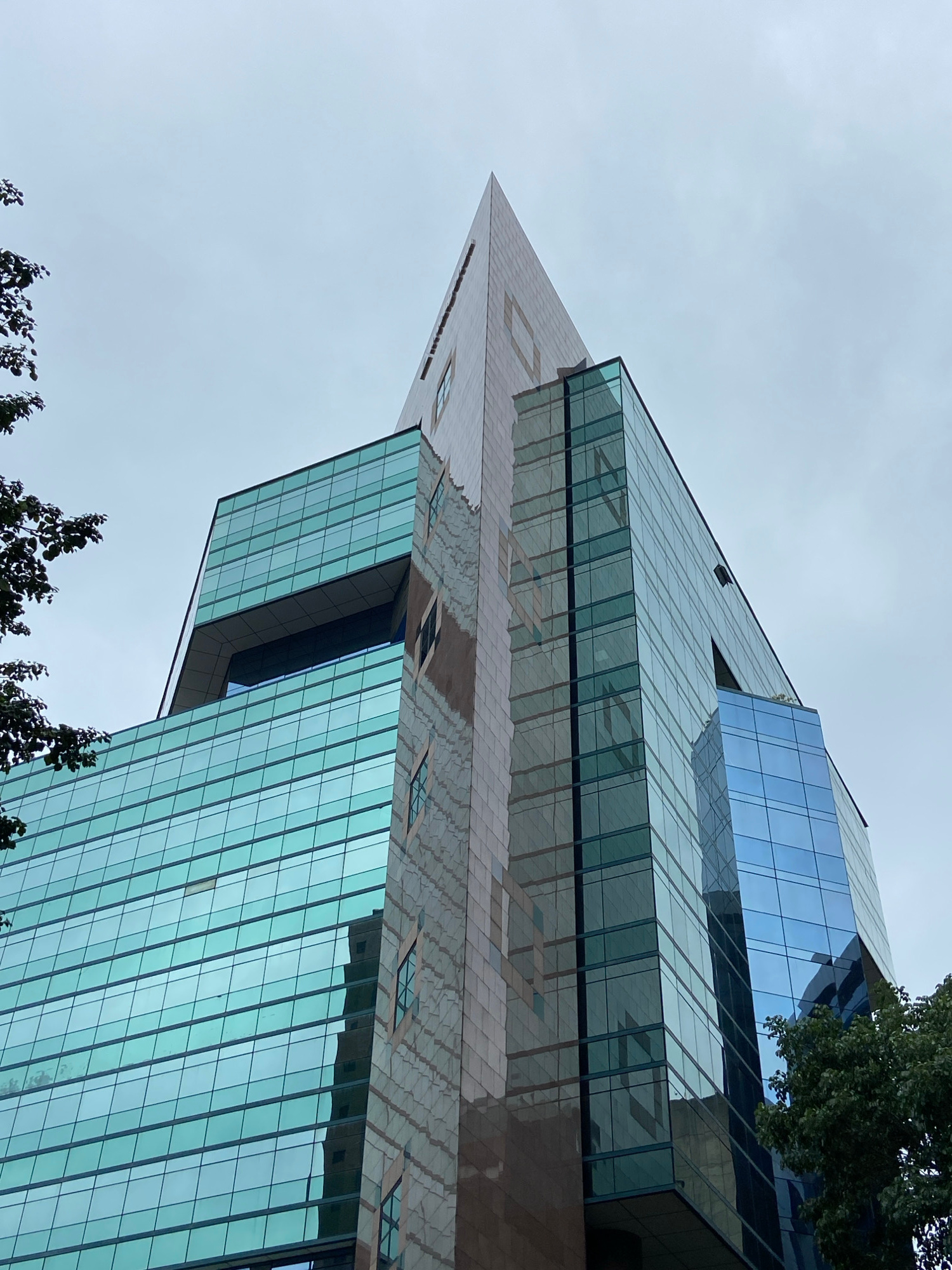 This vertical photograph captures a striking, multi-faceted modern building against an overcast sky in Caracas, Venezuela. The architectural subject dominates the frame, viewed from a low angle lookin…read more